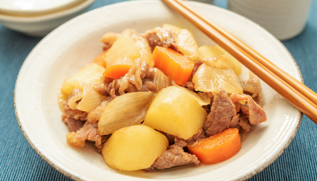 This homestyle dish brings the warmth of a Japanese kitchen straight to your table. Slow-simmered beef, potatoes, and onions soak up the sweet-savory soy broth, creating a comforting meal with every bite.